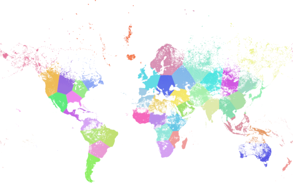 根据上述规格聚类的世界人口产生 46 个聚类。聚类中心位于人口稠密的地区(纽约、莫斯科)。格陵兰岛是一个聚类。有一些跨越反子午线的岛屿聚类。聚类边缘遵循地球的曲率。
