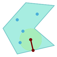 查找不与一组点和线障碍物重叠的最大圆。(多边形几何图形可以作为障碍物包括在内,但只使用它们的边界线。)圆的中心被限制在多边形边界内,默认情况下是输入几何图形的凸包。圆的中心是边界内部与障碍物距离最远的点。圆本身由中心点和一个位于障碍物上并确定圆半径的最近点提供。